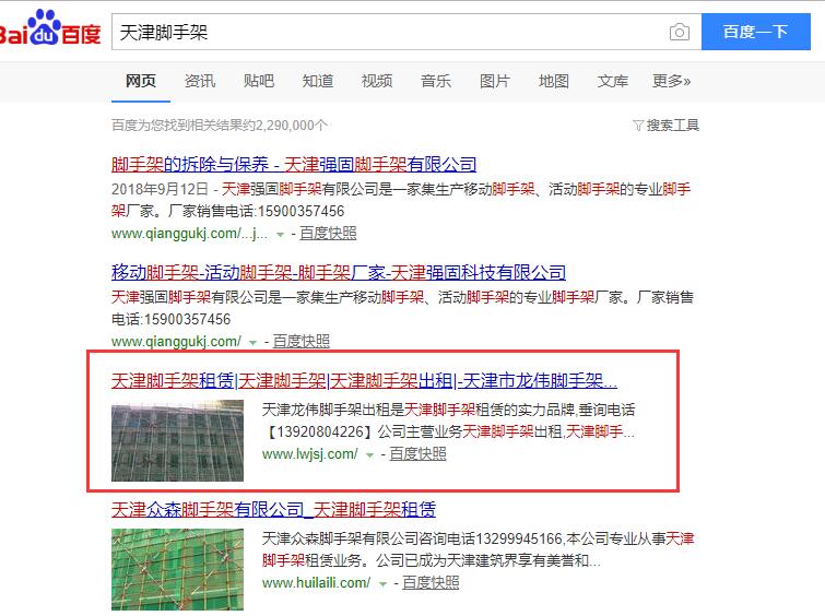 天津龍偉腳手架2012年開始托管我方進行網站維護、網站關鍵詞優(yōu)化排名服務,網站關鍵詞“天津腳手架、天津腳手架租賃 天津腳手架出租”等穩(wěn)定居于百度首頁。