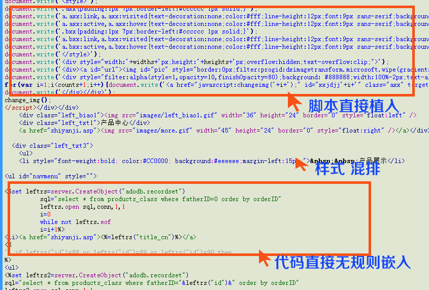 以下代碼截圖是某裝飾公司網(wǎng)站代碼代碼,該裝飾公司在行業(yè)內(nèi)知名度名較高 交換友鏈的時(shí)候發(fā)現(xiàn)他們的網(wǎng)站出現(xiàn)錯(cuò)位,于是老板提出幫忙看一下代碼,處于好心幫著修正了一下部分代碼,不過(guò)整個(gè)網(wǎng)站的代碼可以用一個(gè)詞形容 慘不忍睹,上圖有真相