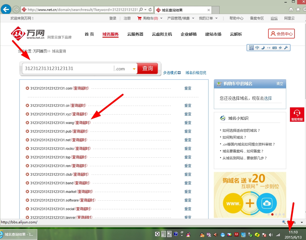 今天給網(wǎng)站制作的一個(gè)客戶注冊(cè)域名,登陸萬網(wǎng)進(jìn)行域名查詢,第一次查詢國際頂級(jí)域名的查詢正常,國內(nèi)域名全部顯示查詢超時(shí)。再次點(diǎn)擊查詢之后,發(fā)現(xiàn)左右的頂級(jí)域名后綴全部面為查詢超時(shí),點(diǎn)擊后面的重查也沒任何作用。作為全國最大的域名注冊(cè)上,每天萬網(wǎng)都會(huì)有大量的域名查詢和注冊(cè)服務(wù),目前尚不清楚什么原因造成的域名注冊(cè)查詢失敗。